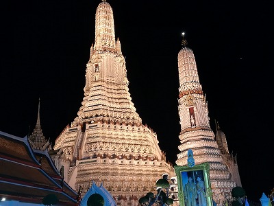 最終日はバンコクへ飛び、午後3時半に着いた空港からは渋滞で安宿への到着は2時間半後。大都会の幼子の花売りや河上バラックに路端の物乞い等、学校で習った経済格差を目の当たりに修学ともなる。寺参りには遅すぎたが、2人掛けのトゥクトゥクに鮨詰めで5人乗り込み船着き場へ。料金1人4バーツ(16円)支払いチャオプラヤー川を渡り「暁の寺」ワットアルンに参詣、ライトアップされた荘厳な仏塔前で家族一緒に念仏し、パーリ語の三帰依を唱和した。そしてバンコクがハブ空港だった頃に何度も訪れたカオサンロードへ、私にとって雄大な自然の風景より血が沸く、世界中のバックパッカー達が集う喧騒は昔も今も旅の原点であり子供達に見せたかった。もと小さな露店を拡大したお気に入りのパッタイ屋で極上のトムヤムクンも食べ、足マッサージで旅の疲れを解し、翌日に中国の春節を迎えたバンコクをあとに帰国した。