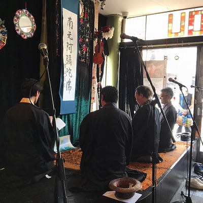 午前中は無料のトラム(路上電車)に乗りカフェを巡り、昼過ぎに会場となる郊外のブランズヴィックへ移動する。私に加え3人の先輩後輩の仲間が渡豪、間衣と輪袈裟を着けステージ中央に掛けられた本尊「南無阿弥陀仏」の軸の前に座す。事前に録音された私の叔父の雅楽の演奏に合わせた5人の僧による「伽陀」の勤行から始まった、黒人白人アジア人のミュージシャンや友人らが集う賑やかなパーティーであった。新郎挨拶の逐次通訳も無事終え、貸し切られたバーで飲めや踊れやと大騒ぎしながら、無二の朋友の新しい門出を見守った。振り返れば本山の研修会に、恐れ多い先輩らを含む100人以上の僧侶が全国から集うなか、新米としてツイストの髪形で現れ何を思ったか「一番怖そうな人に最初に声を掛ける」と決意し、喫煙所で挨拶されたことが彼との出会いであった。以来、共に学び、大いに飲み語り濃密な時を過ごしてきた。昨年一緒に入った京都のバーから遠距離電話でプロボーズし、いま伴侶を定め懸命に生きんとする彼の姿に涙腺が緩んだ。