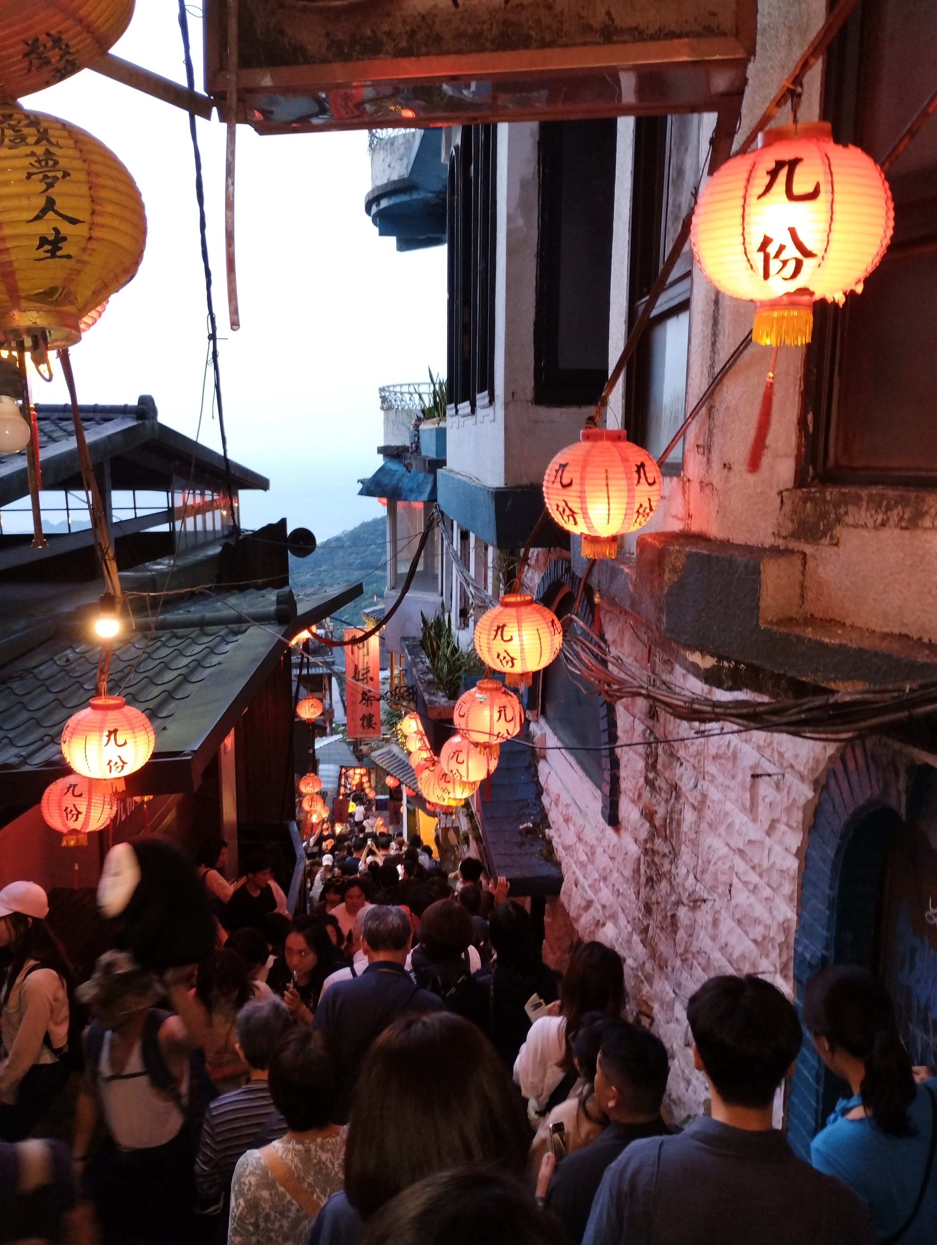 宿で休憩したのち、バス停を探し出し夕方にしゅっぱう、インスタ映えする写真を撮影できる「九份」まで赴いた。1時間ほどバスに揺られ、台湾北部の海岸沿いの丘を登ってゆく。バス停で降りると早速、土産物屋が建ち並ぶ観光アーケード街となっている。赤いランタンが連なる風景は、ジブリ映画『千と千尋の神隠し』の舞台に似ていることから、日本人にも人気の高い場所である。土産物屋を覗き、イチゴ飴やシュークリーム、焼いたエリンギ串など食べ歩く。台北の夜市も同じだが、ガイドブック等で紹介されている店は、何が美味いのかわかりようもない観光客で行列となっている。喫茶店に入るも店内も混雑しておりサービスも悪く、眺めも風情も何もないため、ごった返しの観光客を避けるべく、、丘の階段を降りてゆく。